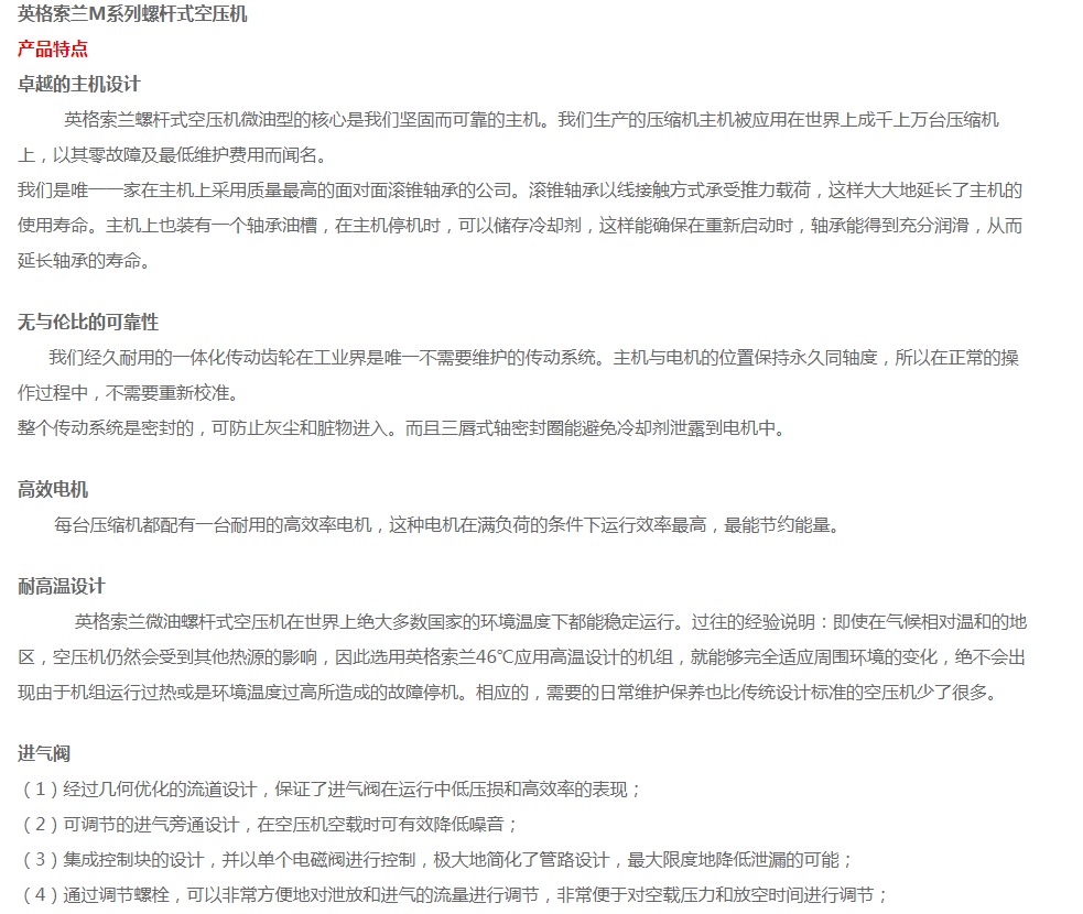 濟南銳博特機械設(shè)備有限公司是英格索蘭空氣壓縮機的授權(quán)代理商,代理銷售美國英格索蘭全系列的空壓機及后續(xù)處理設(shè)備。公司自成立以來,經(jīng)過公司全體同仁不斷努力,開拓創(chuàng)新,以優(yōu)良的技術(shù)、完善的售后服務,使得公司贏得了一個又一個的誠心客戶。我公司擁有多名專業(yè)的銷售及售后服務人員,為客戶提供空壓系統(tǒng)的售前、售中及售后的全方位優(yōu)質(zhì)服務。另公司有多名具有英格索蘭壓縮機授權(quán)服務證書的服務工程師,能維修和保養(yǎng)國內(nèi)外各種品牌空壓機,公司各種國內(nèi)外品牌空壓機配件庫存齊全。